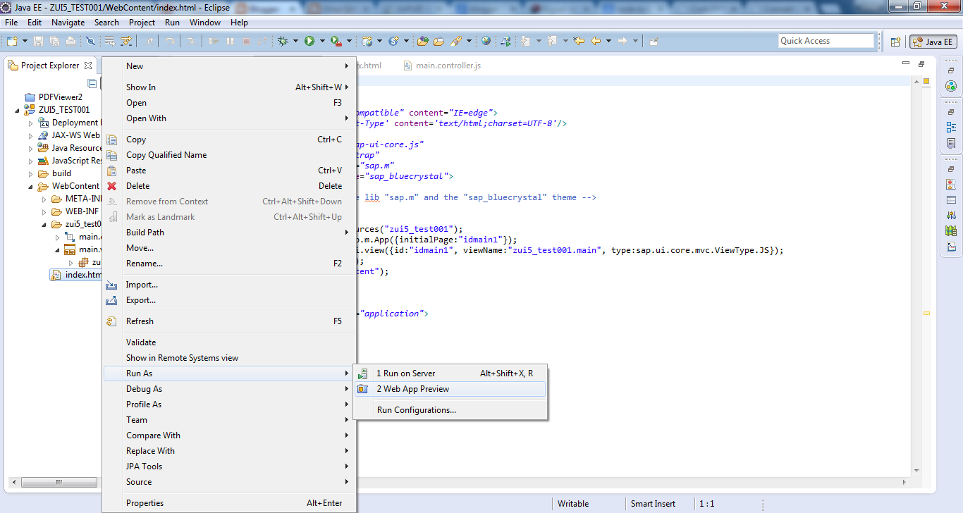 Bunun için projemizin index html sayfasına sağ tıklayıp Run As->Web App Preview seçeneği seçmemiz yeterli.